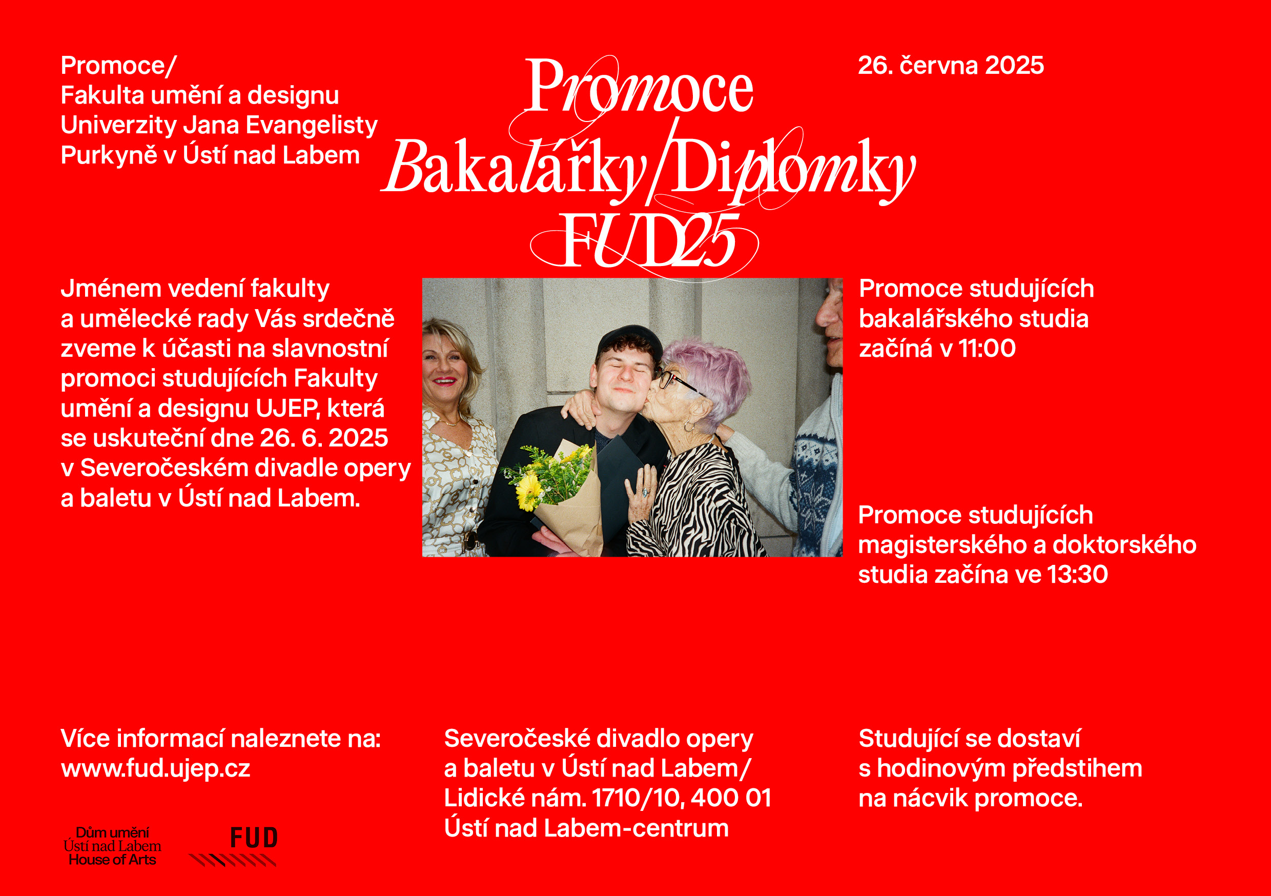 Fakulta umění a designu Univerzity Jana Evangelisty Purkyně v Ústí nad Labem zve na promoce absolventů bakalářských, navazujících magisterských a doktorských studijních programů FUD UJEP 2024/2025, které se budou konat dne 26. června 2025 v Severočeském divadle opery a baletu v Ústí nad Labem.