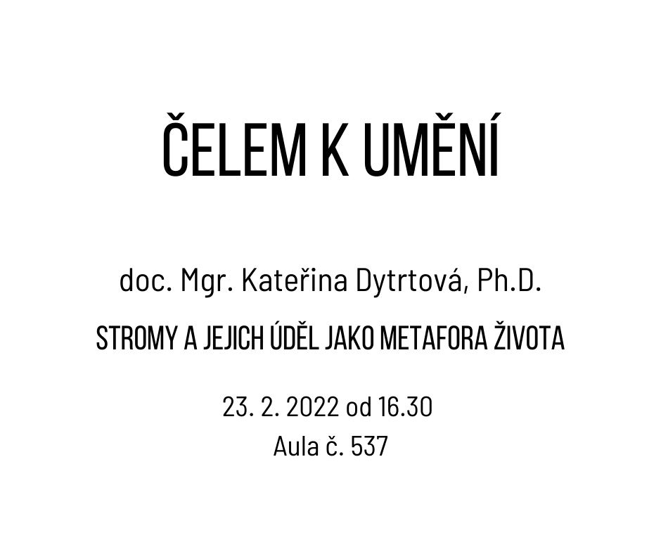 Ve středu 23. 2. 2022 od 16.30 hod v rámci cyklu Čelem k umění uvede doc. Mgr. Kateřina Dytrtová, Ph.D. přednášku s názvem Stromy a jejich úděl jako metafora života. Přednáška proběhne prezenčně v Aule číslo 537.