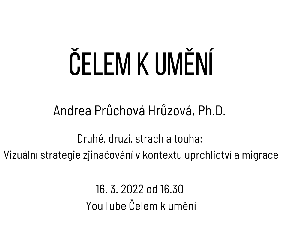 Ve středu 16. 3. 2022 od 16.30 v rámci cyklu Čelem k umění se koná online přednáška, která nabídne průřez současnou digitální vizuální kulturou tvořenou profesionály (novinářské fotografie) i amatéry („vtipné“ koláže na sociálních sítích), jež pracuje s vytvářením a reprodukováním rasových, genderových a kulturních stereotypů a obecně se ptá na otázku „Jak obrazy utváří ty druhé?“. Přednáška bude streamována online zde.