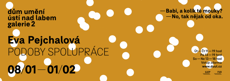 V úterý 7. ledna 2020 Vás srdečně zveme na zahájení výstavy Evy Pejchalové „Podoby spolupráce“, která se koná v Galerii 2 v Domě umění Ústí nad Labem (v dočasných prostorách na Masyrykově ulici) od 17 hodin. Na vernisáž naváže komentovaná prohlídka s autorkou.